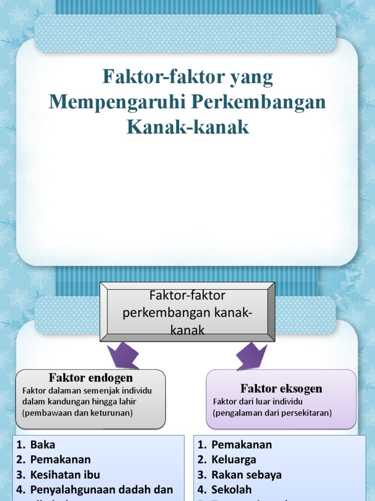 Dan perilaku malah perwatakan ini makin dipengaruhi oleh ibu bapa mereka. Faktor yang mempengaruhi pertumbuhan dan perkembangan tanaman secara garis besar dapat dibedakan menjadi dua, yaitu faktor internal dan faktor eksternal. Kamu tentu pernah berfikir mengapa harga tanah/properti makin hari makin melambung tinggi?. Download faktor faktor perkembangan kanak kanak. Keadaan kelahiran • ibu yang bersalin mengalami kesulitan ketika hendak bersalin, bayi yang lambat dilahirkan itu mungkin akan mengalami kecacatan mental.