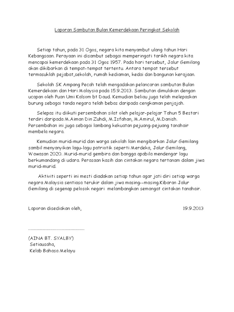 Contoh Karangan Laporan Sambutan Bulan Kemerdekaan Ciupa Biksemad from image.slidesharecdn.com Contoh karangan berita tentang sambutan hari kemerdekaan. Kemerdekaan indonesia ini tentunya memiliki makna yang sangat besar bagi seluruh warga indonesia. Perjuangan telah dilakukan dengan gigih. Laporan dokumentasi sambutan hari guru tahun 2016 sekolah kebangsaan tengku mahkota. Kemerdekaan, gambar hari kemerdekaan, karangan hari kemerdekaan, hari kemerdekaan indonesia, sajak hari kemerdekaan, sambutan hari kemerdekaan 2018, program intervensi: Setiap tahun negara kita akan mengadakan sambutan hari kemerdekaan negara bagi mengingati detik bersejarah yang amat berharga kepada semua rakyat malaysia. Himpunan laporan sambutan hari kemerdekaan. Kertas kerja sambutan hari raya.