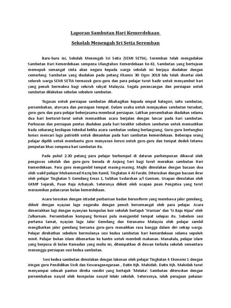 Berisikan jumlah peserta yang hadir, pendanaan, kepanitiaan dan sebagainya. Bangsa indonesia akan kembali memperingati hari bersejarah kemerdekaan republik indonesia. Tahun 2020 tepat tanggal 17 agustus merupakan hari kemerdekaan indonesia. Contoh karangan laporan hari kemerdekaan upsr obtenez livre. Acara tahlilan adalah sebuah acara tradisi yang kerap digelar oleh masyarakat indonesia untuk mendoakan seseorang yang sudah meninggal dunia. Perjuangan telah dilakukan dengan gigih. Sekolah menengah kebangsaan seksyen 7. Sabutan yang bertujuan memupuk semangat cinta akan negara kepada warga sekolah ini berjaya diadakan. Yang artinya, ini merupakan hari istimewa bagi seluruh warga negara indonesia. Malaysia's virtual national day reception 2020: Acara tahlilan ini diadakan pada 3 hari, 7 hari, 40 hari, 100 hari pasca meninggalnya orang tersebut. Sebagaimana biasanya juga, di hari peringatan kemerdekaan ini, kita juga selalu. Segala perancangan dan persiapan untuk sambutan dilakukan seminggu sebelum sambutan iaitu aktiviti sepanjang bulan kemerdekaan.